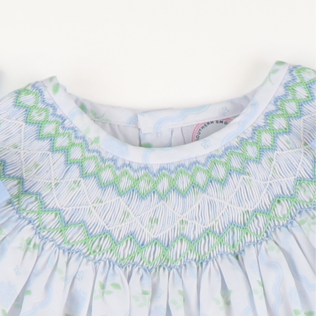 Our timeless and classic Smocked Geo Bishop is perfect for the entire season! Sweetsmocked bishop is in our beautiful Hydrangea Bloom Print and features detailed geometric diamond smocking and picot trim. Angel wing sleeves with light blue satin ribbon shoulder accents complete the look.