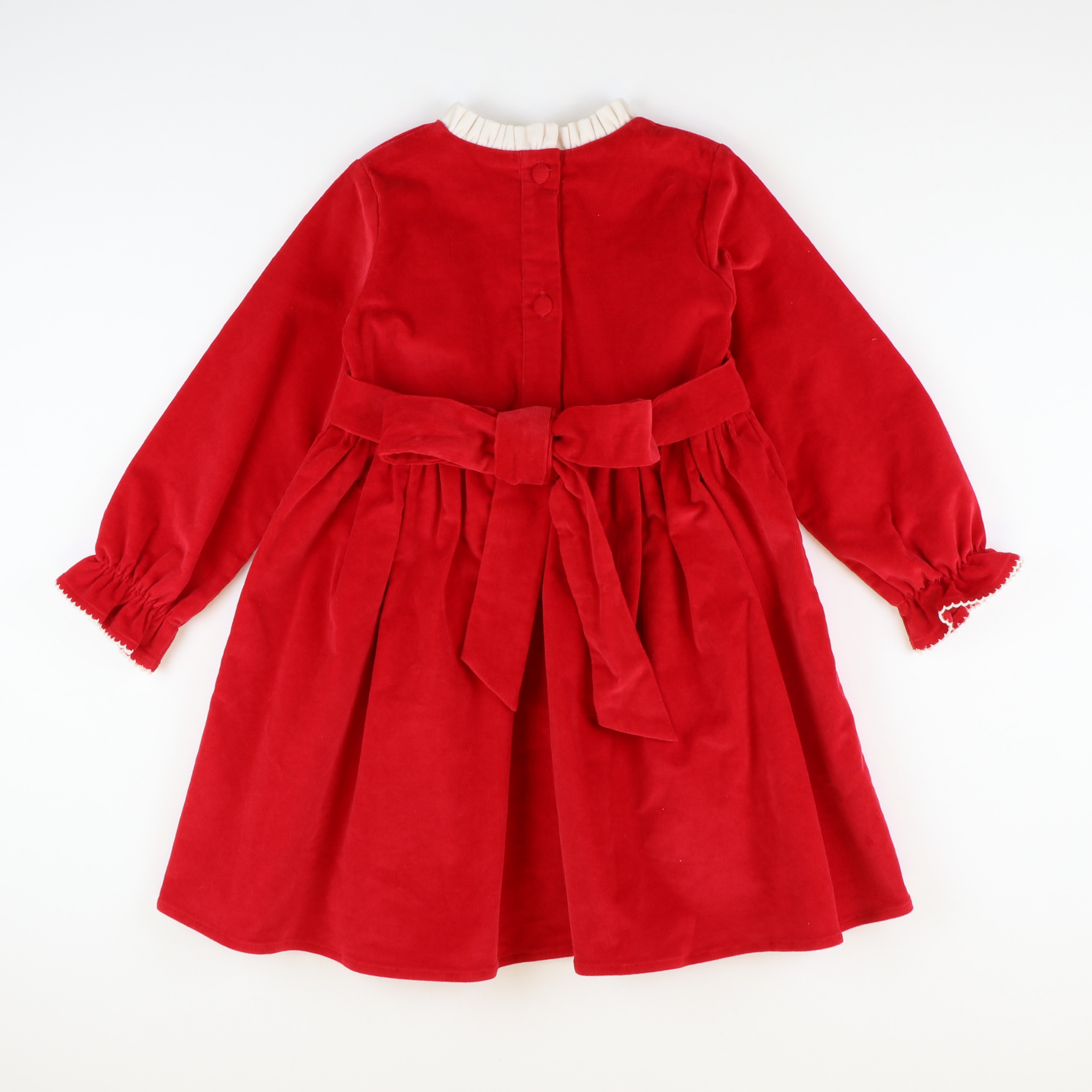 'Tis the season to get excited about party dresses! Our sweet Corduroy Bow Dress provides a whimsical holiday look for her! Darling dress is in a beautiful holiday red corduroy with a contrasting cream corduroy pleated collar and stylish bow. Functional tie back. Fully lined. Long sleeves are elasticized for extra comfort.