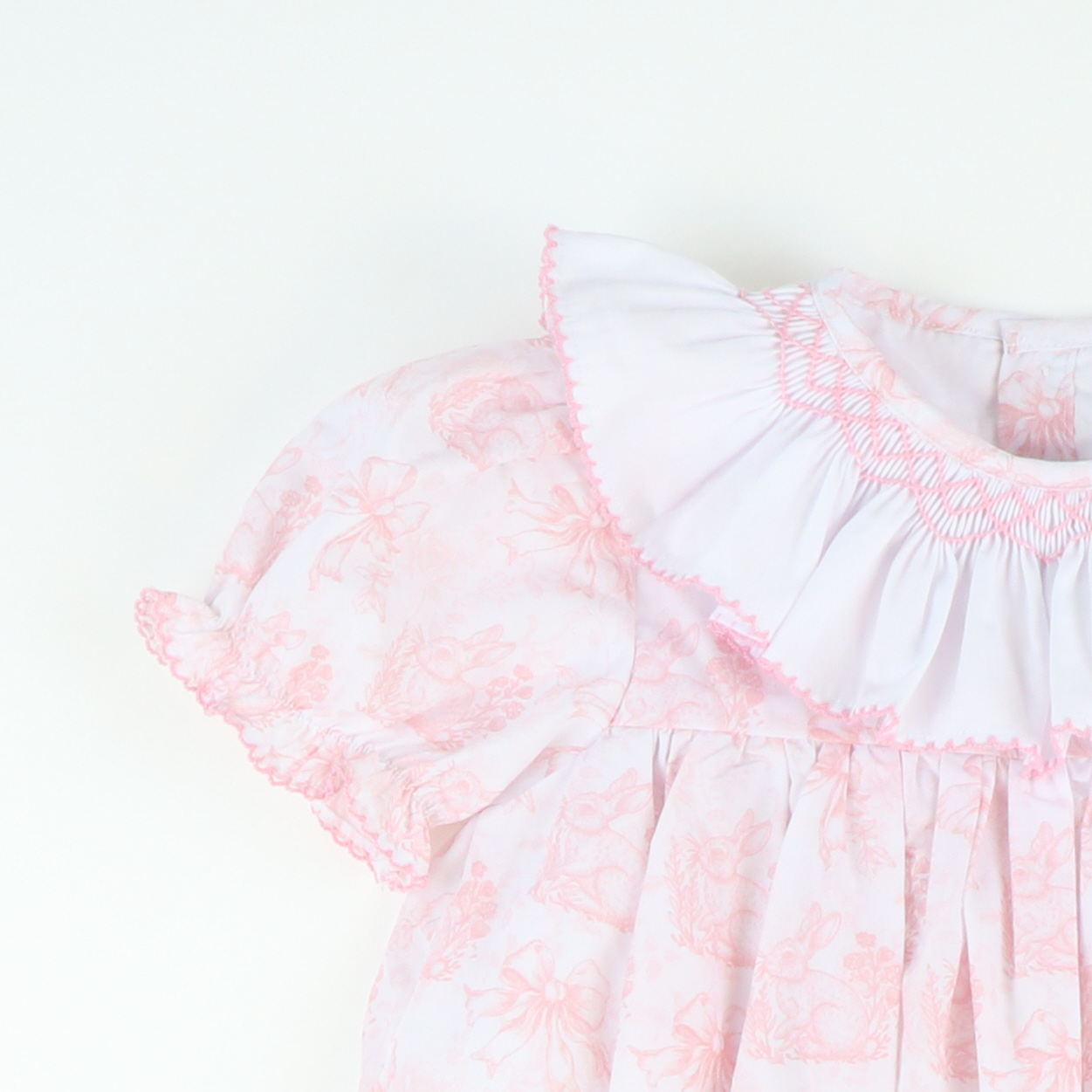She'll be ready for every spring occasion in our sweet Smocked Ruffle Neck Dress! This darling dress comes in our beautiful Pink Bunny Toile print and features a white ruffle collar with light pink geometric smocking and traditional ruffle puff sleeves. Fully lined.
