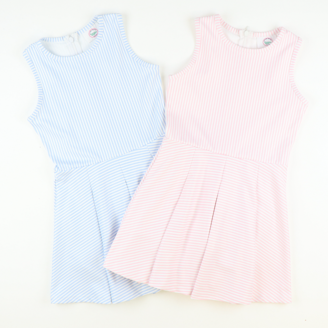 Our Performance Dresses are perfect for your active girl, from the playground to the tennis court and everywhere in between! Built-in shorts with pockets and a stylish racerback cut allow for freedom of movement and increased range of motion. Available in light blue and light pink stripes.