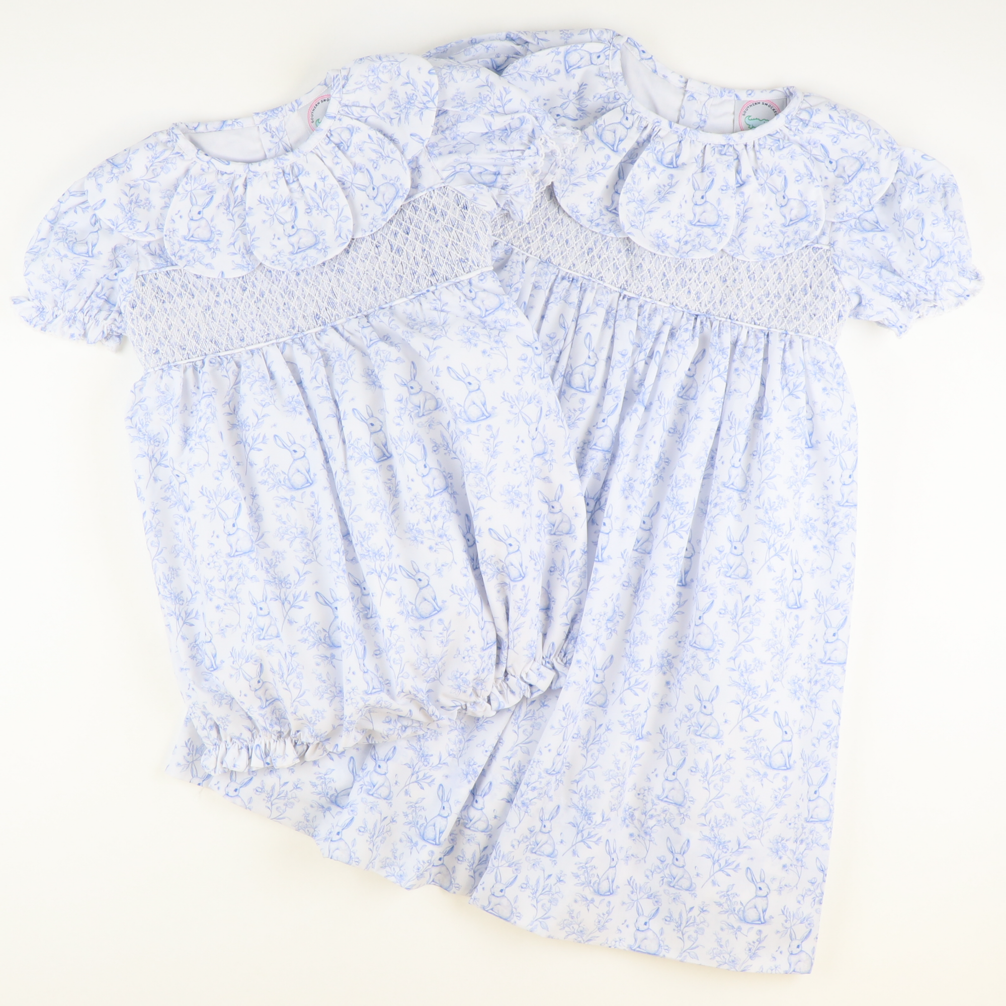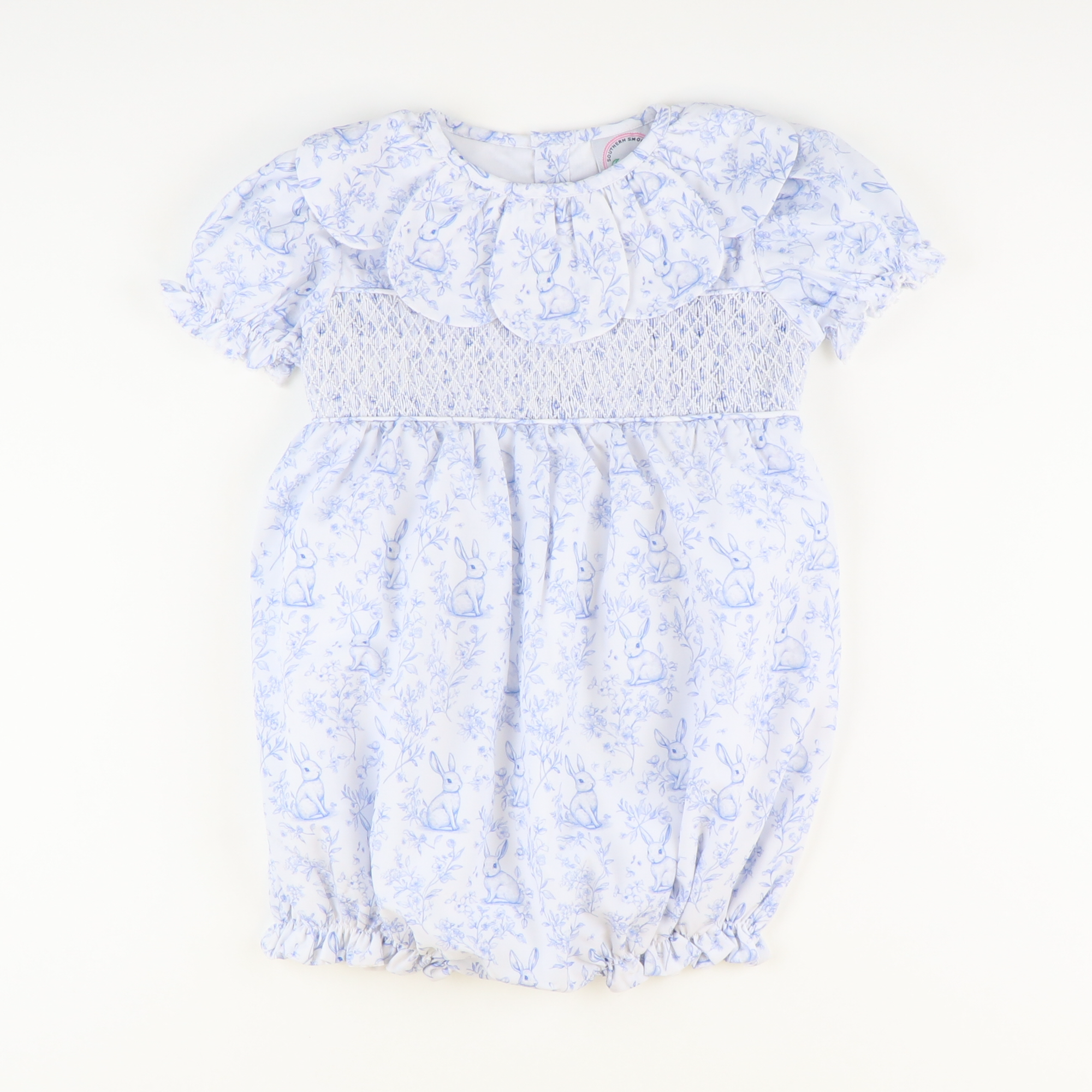 Petal Collar Smocked Girl Bubble - Blue Bunny Toile