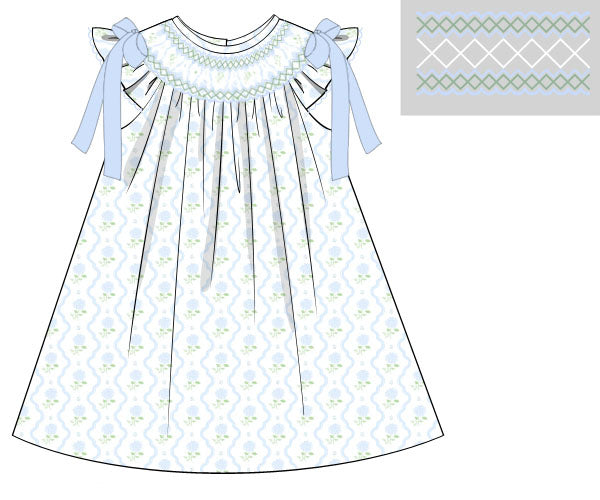 Our timeless and classic Smocked Geo Bishop is perfect for the entire season! Sweetsmocked bishop is in our beautiful Hydrangea Bloom Print and features detailed geometric diamond smocking and picot trim. Angel wing sleeves with light blue satin ribbon shoulder accents complete the look.